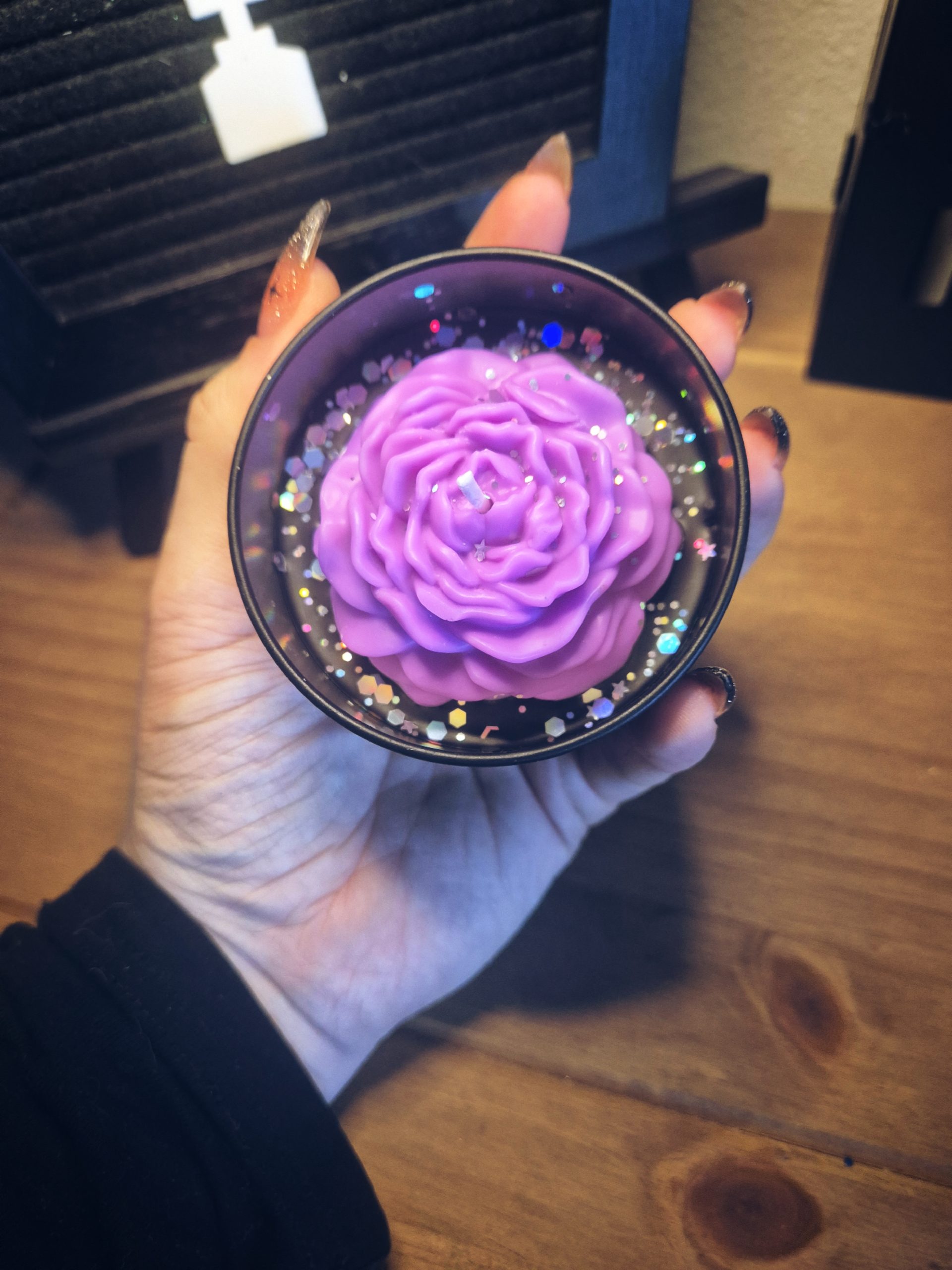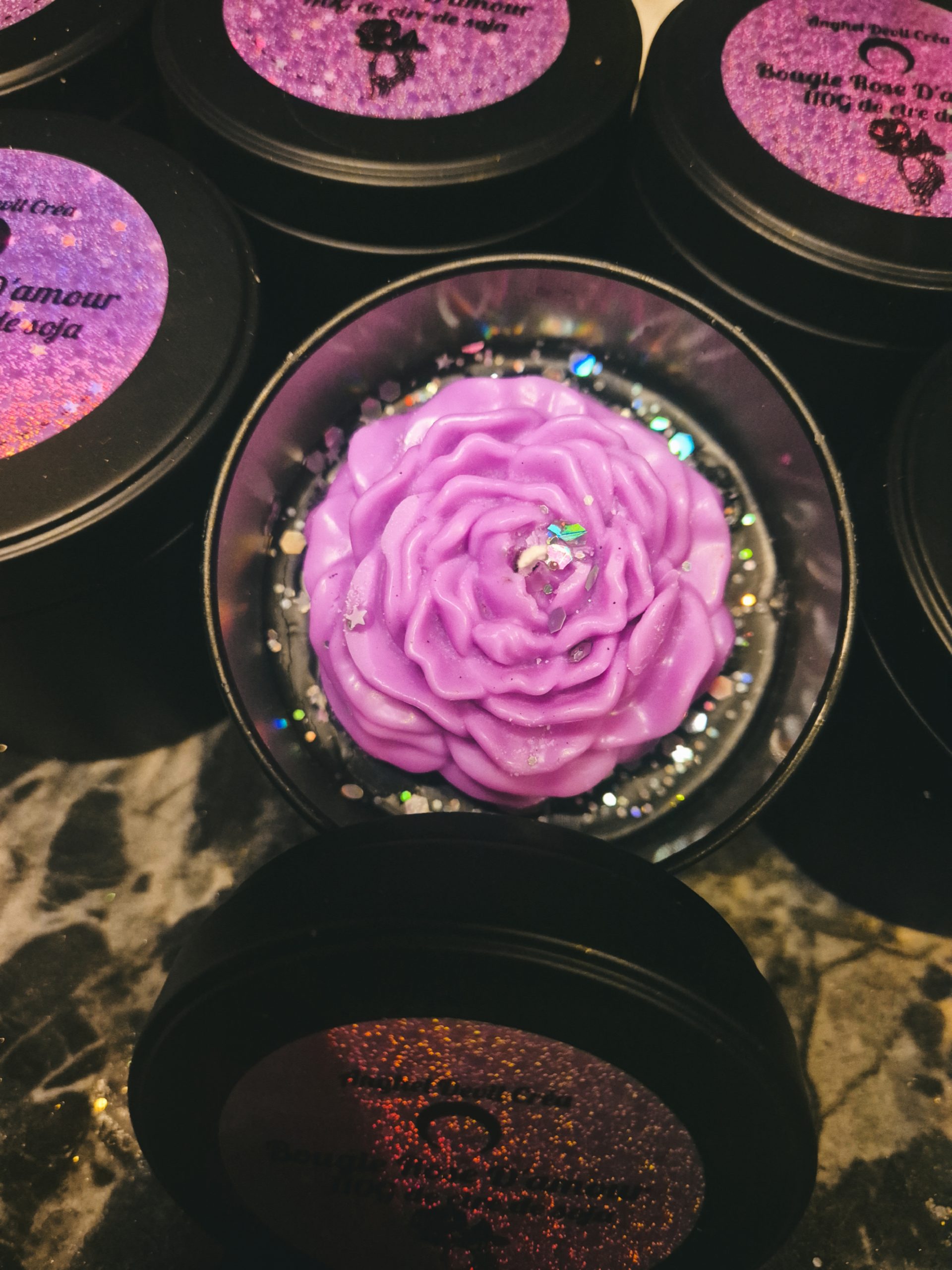 Bougie élégante avec sa fleur mauve à la fragrance Rose D’amour (cassis grenade une pointe de musc) contient 110g de cire de soja.