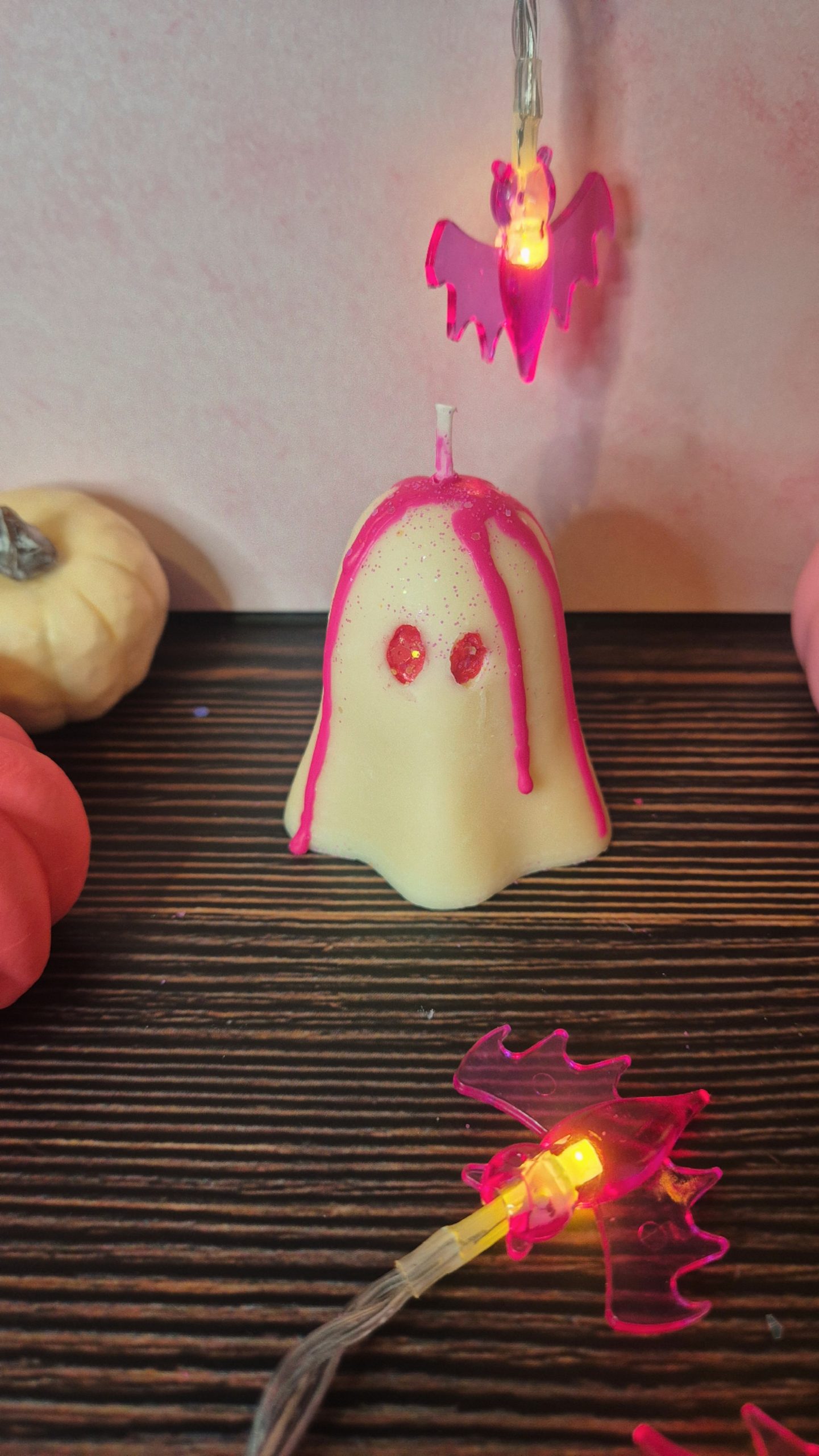 Bougie Pinky ghost, à la fragrance barbe à papa avec son coulis rose à paillettes qui lui donne sa touche originale. 75 g  de cire de soja.